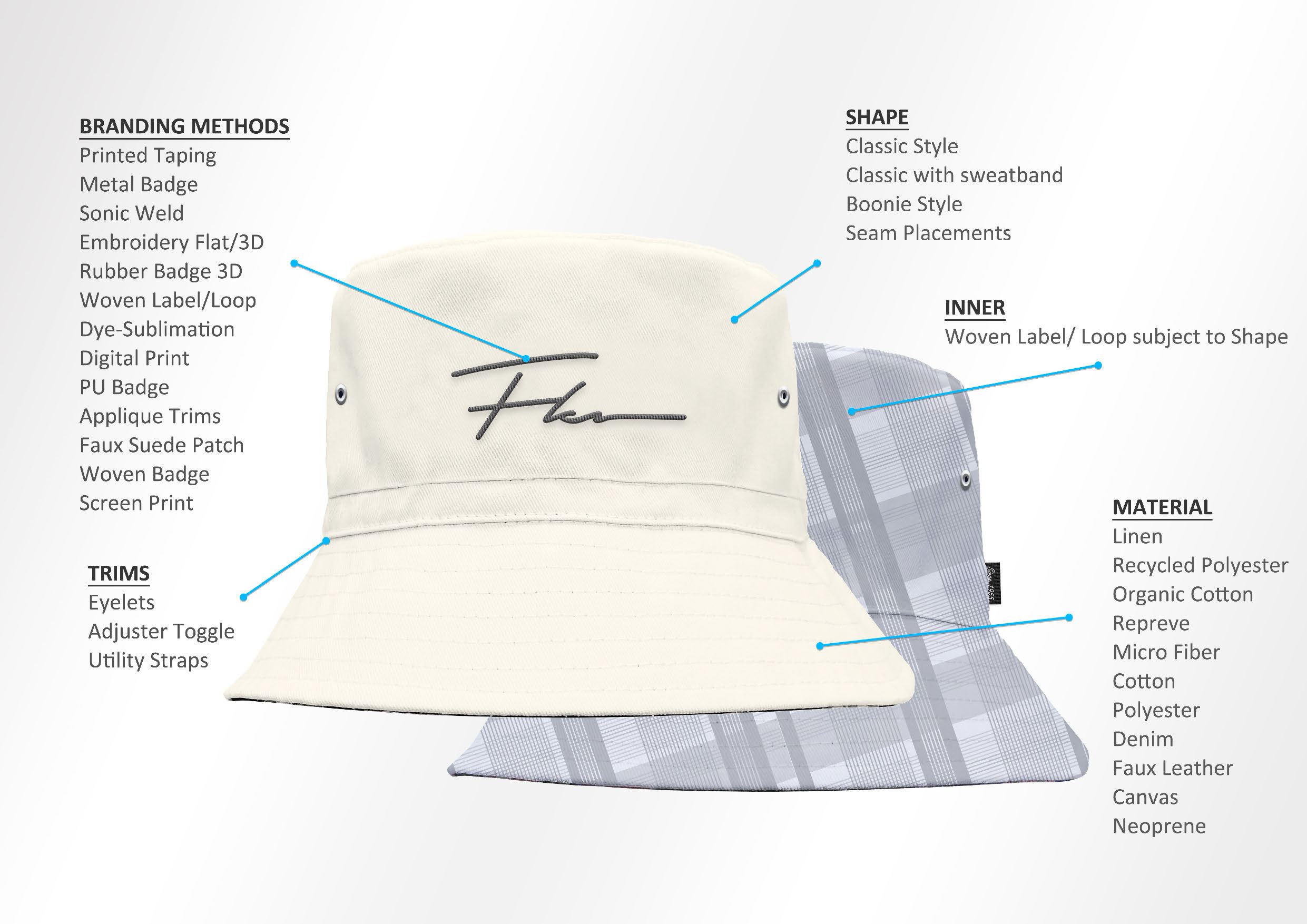 End-to-End Expertise You Can Trust Drawing on years of collaboration with leading global brands, our seasoned team provides comprehensive guidance at every stage. From initial concept sketches, material sourcing, and design refinement to prototyping, production, and final quality assurance — we partner closely with you to bring your perfect hat to life.